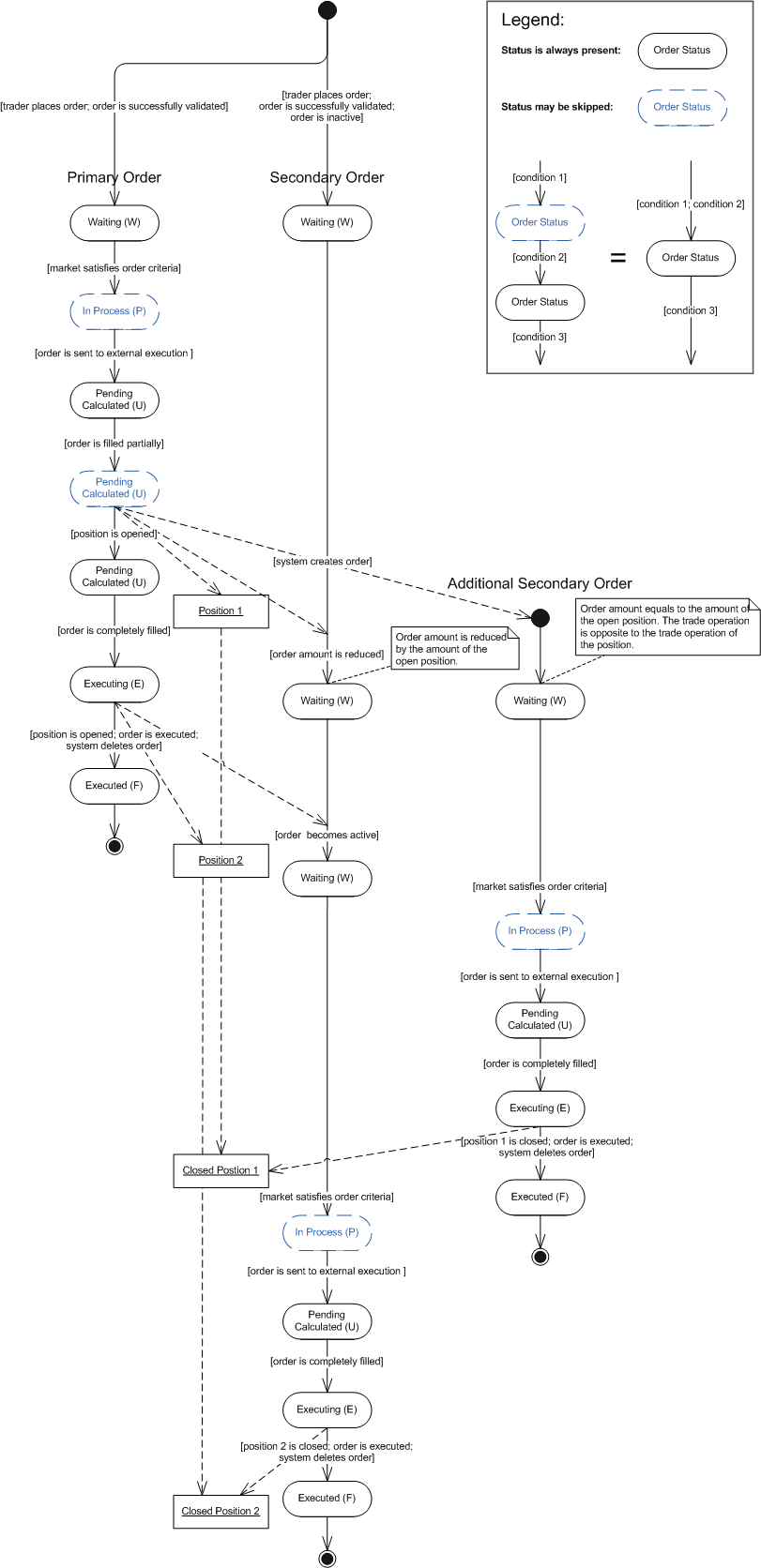 The primary order is completely filled in portions. The secondary order closes the position. The additional secondary order is created during primary order execution.