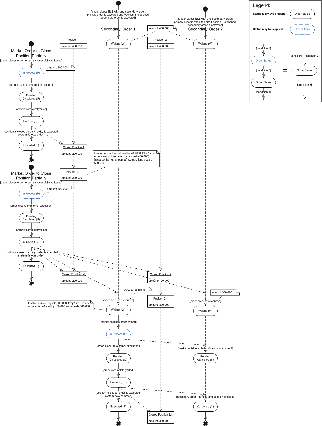 So there are two opened positions with net amount equals 800, and two secondary orders the amount of each equals 400,000. Then the market order is placed to reduce position amount by 200,000. The market order is executed and the first position (according to FIFO rules) is closed and a new position with remaining amount of 200,000 is opened. The amount of the secondary orders is remains unchanged because the net amount of two positions equals 600,000 that is greater than each secondary order amount (400,000). After that one more closing market order with amount equals 300,000 is placed. The market order is executed, and the first position is completely closed, and the second position is closed partially (300,000 remains opened). The amount of secondary orders is reduced by 100,000 and equals 300,000 that is not exceed the position amount. The market satisfies the criteria of the first secondary order, the order is successfully executed, the second position is closed, and the other secondary order is cancelled.