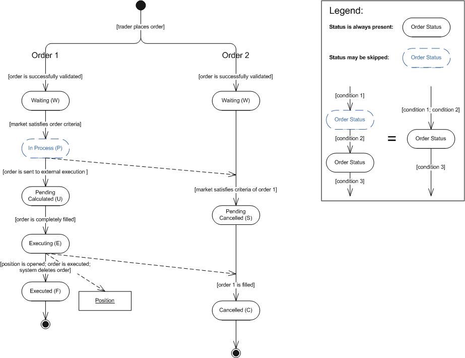 In this scenario, the OCO contingent order consists of two orders. The market satisfies the criteria of the first order. The first order is successfully executed in one go. The second order is canceled.