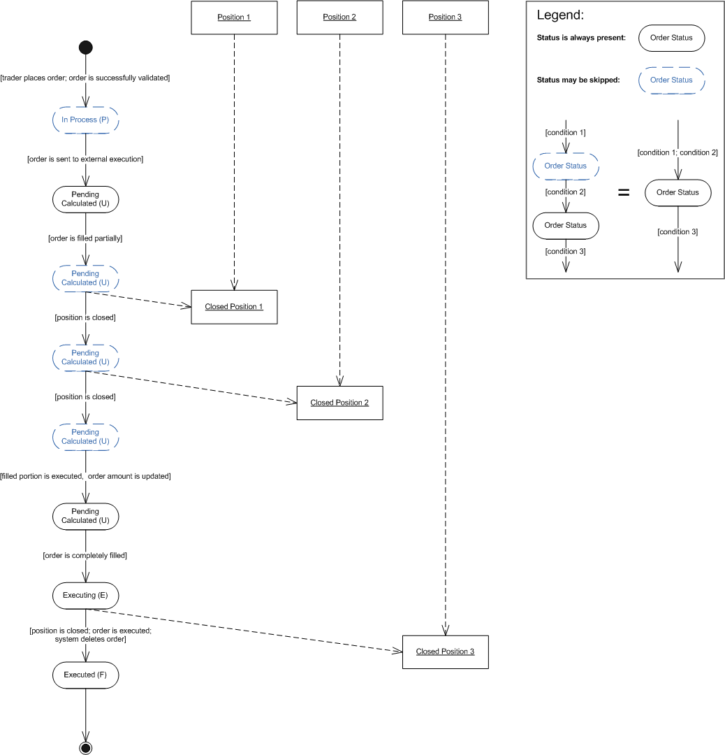 A close market order with GTC time-in-force option is specified as a net amount order. The order is placed to close three positions. The order is completely filled in two portions. The first portion closes the first two positions, the second portion closes the third position.