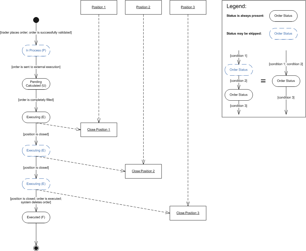 A close range order with IOC time-in-force option is specified as a net amount order. The order is placed to close three positions. The order is completely filled in one go. The positions are closed.